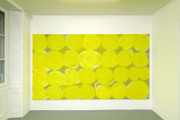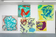 Dans les nouvelles toiles, la plupart de format moyen ayant été produites cette année à l’atelier sans circonstance spécifique, Renée Levi met en tension et bouscule la ligne intuitive et fluo au spray qui lui est caractéristique. Sa forme est reprise et répétée en aplats segmentés, épais et géométriques, contraignant le dessin initial et permettant de nouvelles compositions hybrides et dynamiques. Si la répétition du motif est inhérente au processus pictural, physiquement engagé, de l’artiste, le déplacement de son geste premier vers l’abstraction géométrique, est tout à fait inédit et expérimental.Entre la toile et le mur, la compression et l’expansion, la ligne qui se fait lettre et celle qui devient surface, la contrainte et le débordement, c’est toute une dialectique de jeu et d’introspection de sa peinture que Renée Levi inaugure et déploie à la Villa du Parc.