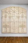 La présente exposition permet d’en reconnaître le cheminement. En effet, un groupe d’œuvres récentes est mis en rapport avec un important relief de 1992. Ce dernier, constitué de 30 éléments de couleur ivoire, se singularise par l’apparente rigueur des ordres fantasmagoriques qu’il associe. Constitué de trois arches monumentales, creusées d’entablements, de frises et de pilastres, et surmontées de deux mascarons joufflus qu’entoure un réseau d’ornements serpentins, ce relief offre un puissant contraste entre la frontalité de sa présence et les multiples perspectives que suggèrent en lui les imbrications d’ouvertures qui le composent. De par sa couleur et sa construction, cette œuvre déploie le sentiment d’une austère complication ; on y voit volontiers la ruine fantomatique d’un théâtre que l’esprit veut habiter de formes brûlantes à la voix blanche et immobile. De là, peut-être, vient la sensation lancinante de grandeur que l’on ressent face à lui.