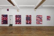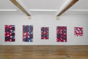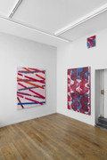 Il y a quelque chose d’assez ardu dans le fait d’écrire sur une œuvre qui, comme celle-ci, se définit par sa grande constance. La méthode de l’artiste est peu ou prou la même depuis 1983, avec quelques variations de gestes, de couleurs, de motifs. Il achète de la toile de confection de couleur rouge au marché Saint-Pierre. Il la découpe sur un grand cadre, l’enduit de colle, l’agrafe au mur, puis l’apprête à l’aide d’une acrylique blanche très diluée. Il la pose ensuite au sol, ce qui crée un léger frottage, puis la tend sur un châssis. L’artiste y peint alors en rouge des motifs simples, qui donnent tantôt des « tableaux-formes », tantôt des « tableaux-lignes.